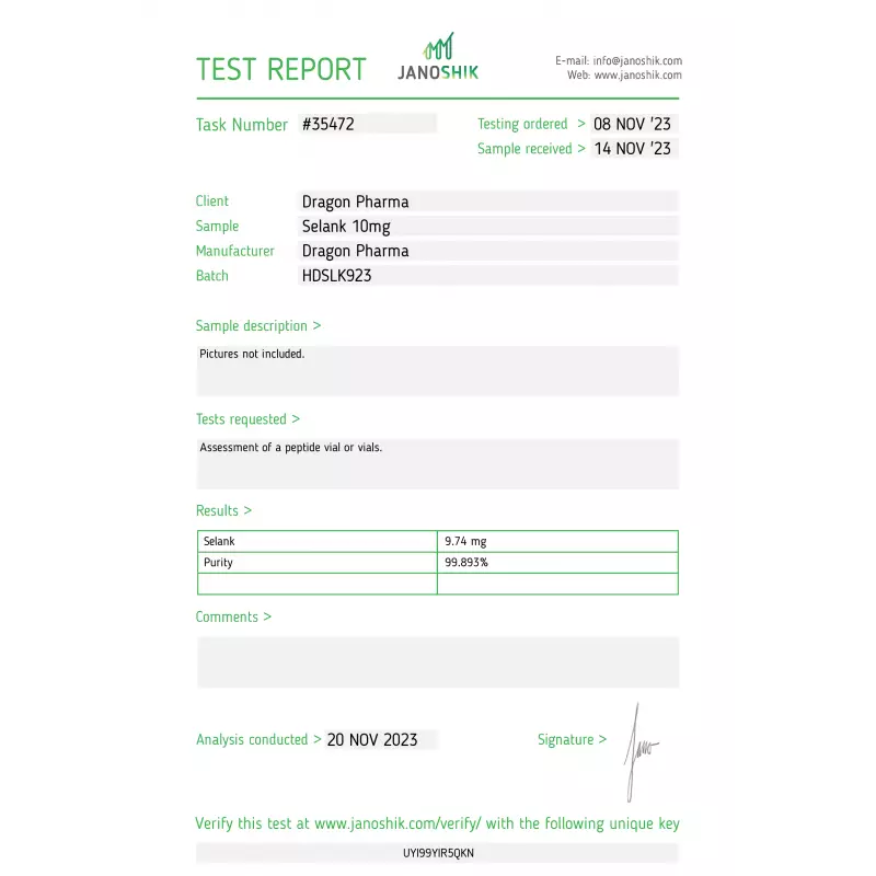 Every vial of Dragon Pharma Selank is produced under strict quality control conditions. The independent lab test conducted on November 20, 2023, confirmed a potency of 9.74 mg per vial, demonstrating Dragon Pharma’s commitment to transparency and product accuracy. This level of verification ensures you are receiving a high-purity, effective product you can trust. We encourage users to compare our third-party testing with other brands to see the Dragon Pharma difference.